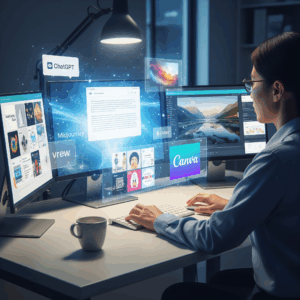 ChatGPT等の対話型AI、画像生成(Midjourney等)、動画編集(Vrew等)、デザイン(Canva等)を横断的に扱い、ツールを組み合わせたアウトプット作成力を養成します。